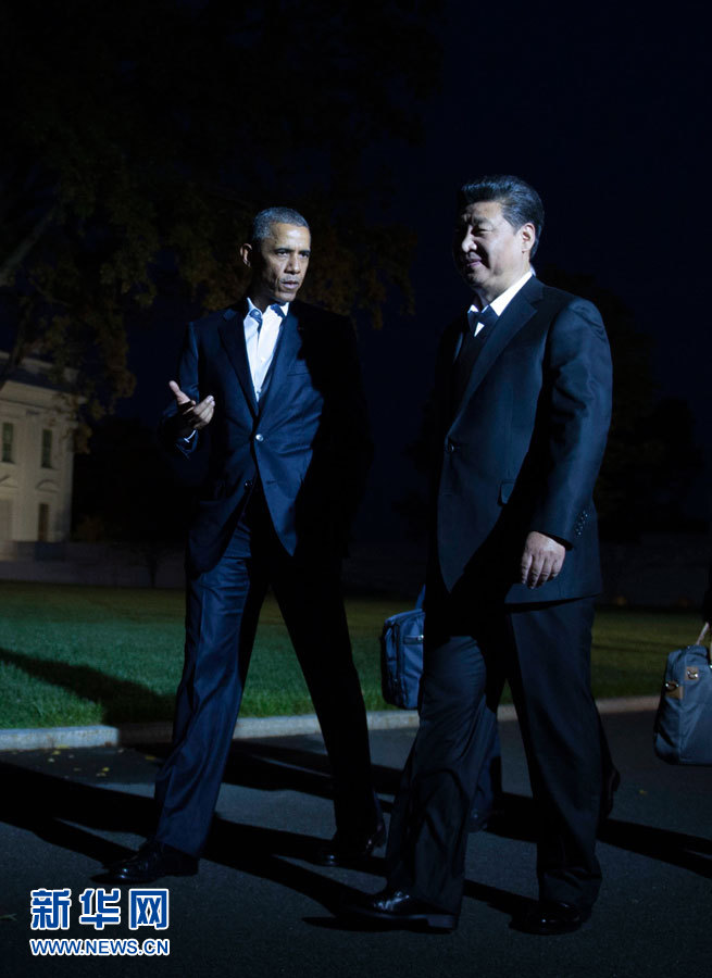 9月24日,国家主席习近平在华盛顿出席美国总统奥巴马举行的私人晚宴。这是习近平和奥巴马从白宫步行前往举行晚宴的国宾馆。新华社记者李学仁摄