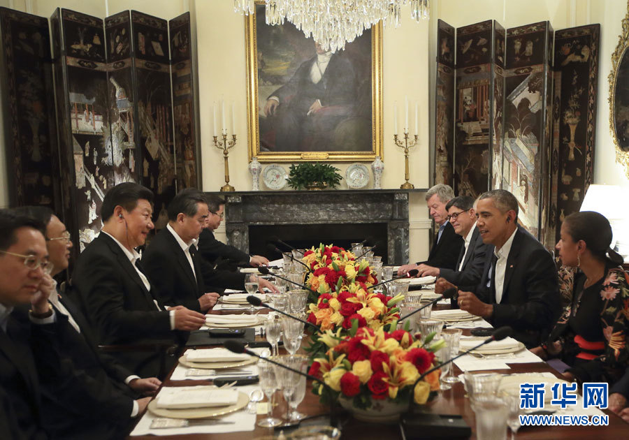 9月24日晚,国家主席习近平在华盛顿布莱尔国宾馆同美国总统奥巴马举行中美元首会晤。 新华社记者兰红光摄