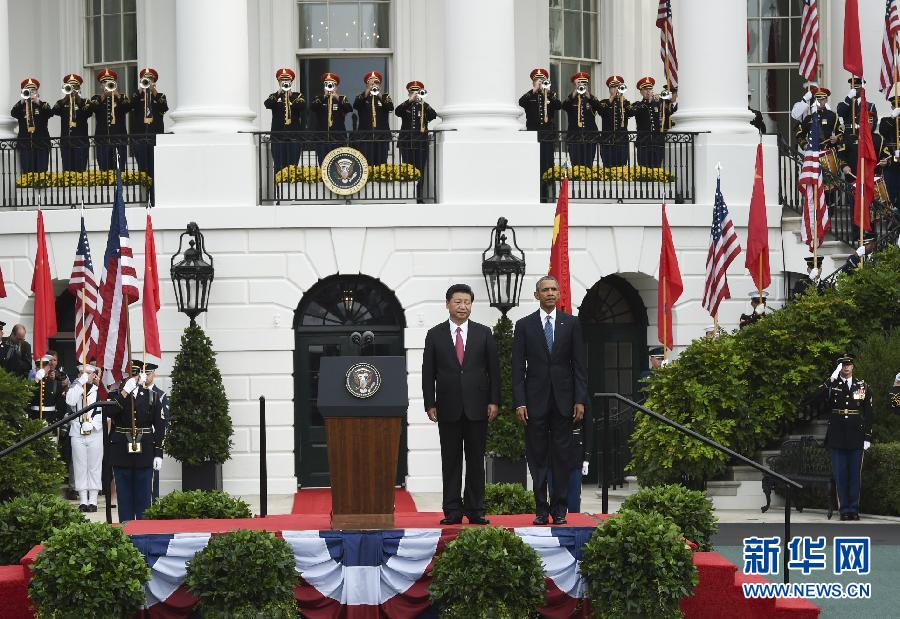 9月25日,中国国家主席习近平在华盛顿白宫南草坪出席美国总统奥巴马举行的欢迎仪式。 新华社记者李学仁摄