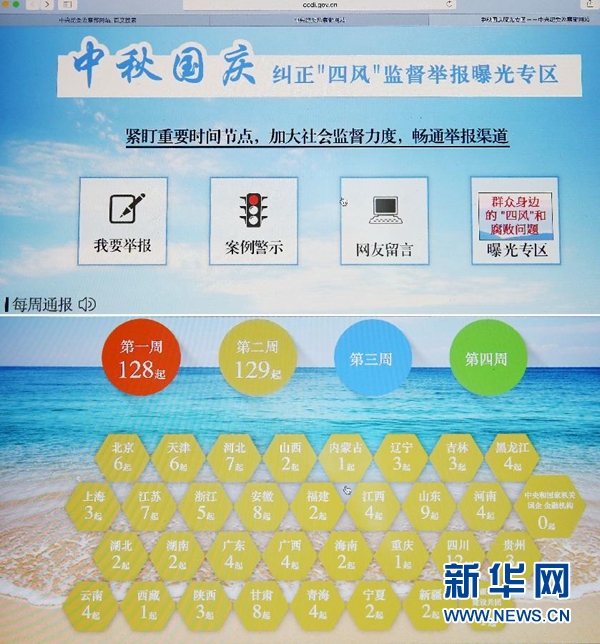 这是9月27日拍摄的中央纪委监察部网站开设的“中秋国庆纠正‘四风’监督举报曝光专区”(拼版照片)。新华社发
