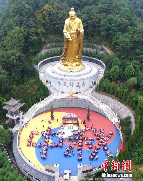 9月26日晚,河南老君山数百人围坐于世界第一老子铜像下,拼成“中秋”二字,共吃团圆盛宴。中新社记者 王中举 摄