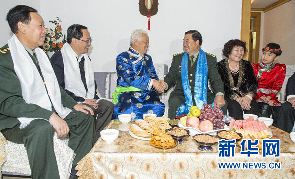 9月27日,中央军委委员、总后勤部部长、中央代表团副团长赵克石率中央代表团五分团在新疆巴音郭楞蒙古自治州、哈密地区看望慰问当地各族干部群众。这是赵克石来到库尔勒市巴音小区看望蒙古族退休教师哈木图巴依尔,并与他和家人共度中秋佳节。新华社记者 江文耀 摄