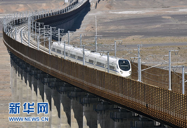 动车行驶在哈密地区的一座大桥上(2015年5月22日摄)。 新华社记者 吴丹妮 摄