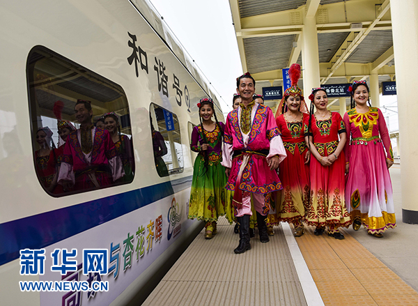 身穿民族服饰的当地居民在吐鲁番北站迎接首批乘坐“高铁杏花专列”抵达前来旅游的游客(2015年3月21日摄)。 新华社记者 赵戈 摄
