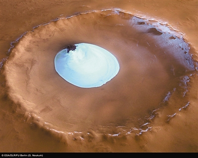 拍摄者:火星快车(ESA) 欧洲宇航局(ESA)“火星快车”探测器2005年拍摄的照片显示,火星北极附近有一处巨大火山口,其中心地带为一片白色冰层所覆盖。