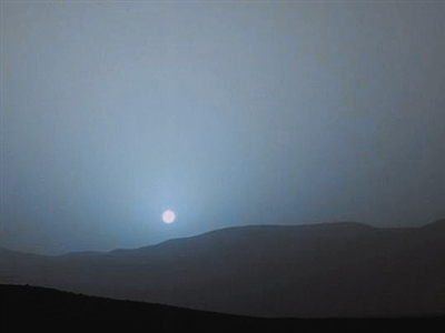 发现者:“好奇号”火星车(NASA) 2015年4月15日拍摄,地平线附近,阳光穿越火星富含尘埃的大气最底层时产生的“蓝色光芒”。
