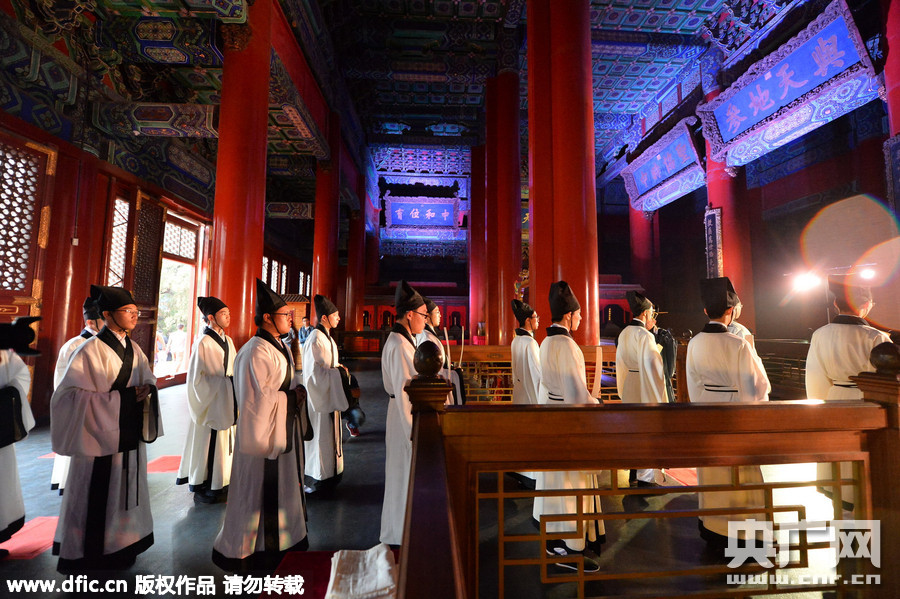 2015年9月28日,中国北京,在具有700多年历史的国子监孔庙,举行祭孔大典,标志着为期20天的第五届孔庙国子监文化节闭幕。为纪念“至圣先师”孔子诞辰2566周年,两百余名来自广渠门中学的学生在孔庙中院高声诵读《大同礼运篇》……祭孔大典和拜师仪式一起成为历届国学文化街的国学经典活动。