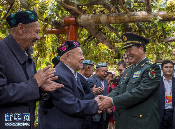 9月29日,中央军委委员、总后勤部部长、中央代表团副团长赵克石率中央代表团五分团在吐鲁番看望慰问当地各族干部群众。这是赵克石在吐鲁番葡萄沟慰问当地群众。新华社记者江文耀摄