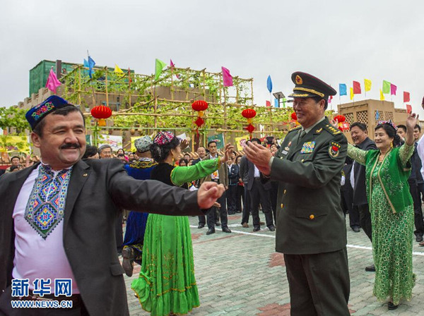 9月29日,中央军委委员、总后勤部部长、中央代表团副团长赵克石率中央代表团五分团在吐鲁番看望慰问当地各族干部群众。这是赵克石在吐鲁番高昌区亚尔镇交河小镇与当地群众在一起。新华社记者江文耀摄