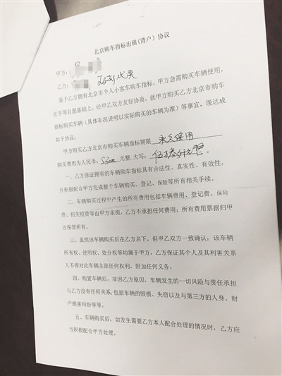 据天津商人吴先生称,去年6月,他通过位于花乡车市的一个二手车中介公司,与安女士达成买卖意向,双方签署了“北京购车指标出租(背户)协议”,称鉴于安女士拥有北京市小客车购车指标,吴先生急需购买使用,双方在平等自愿的基础上达成协议,吴先生购买安女士北京市购买车辆指标永久使用,购买价格为5.3万元。随后吴先生便将自己的帕萨特轿车登记在安女士购车指标的车牌号下。