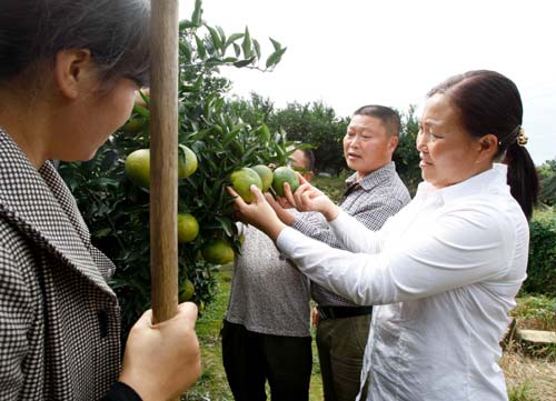 图为四川成都蒲江县西来镇两河村支书姚庆英关心村民的柑橘生产。王若冰摄