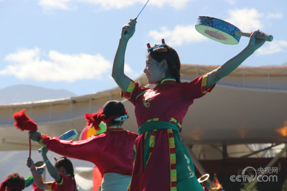 先出场的姑娘敲响了手鼓,小伙子摇着手铃随后上场。(央视网记者 何川)