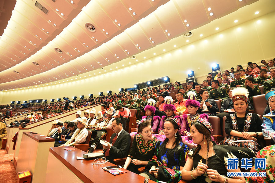 10月1日,庆祝中华人民共和国成立66周年暨新疆维吾尔自治区成立60周年大会在新疆人民会堂举行。图为参会的少数民族代表在会前交谈。新华网记者 郭小天 摄