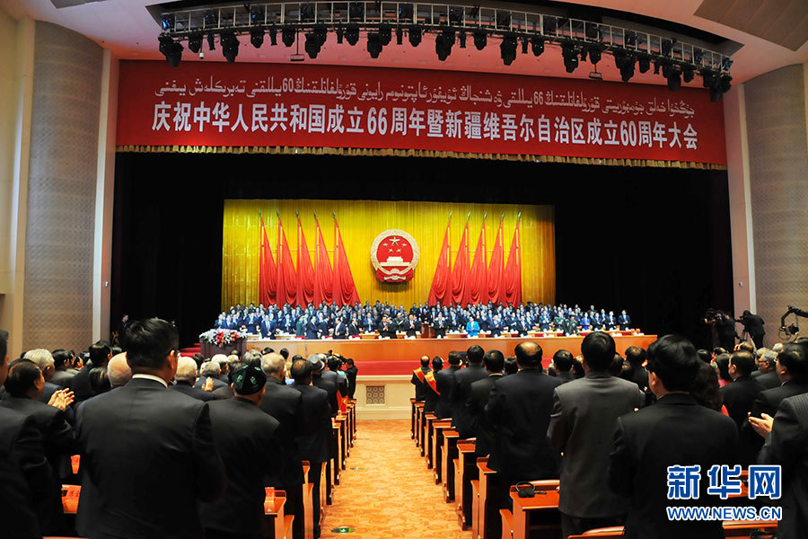 10月1日,庆祝中华人民共和国成立66周年暨新疆维吾尔自治区成立60周年大会在新疆人民会堂举行。图为大会开始现场全体观众起立鼓掌。新华网记者 王新彪 摄