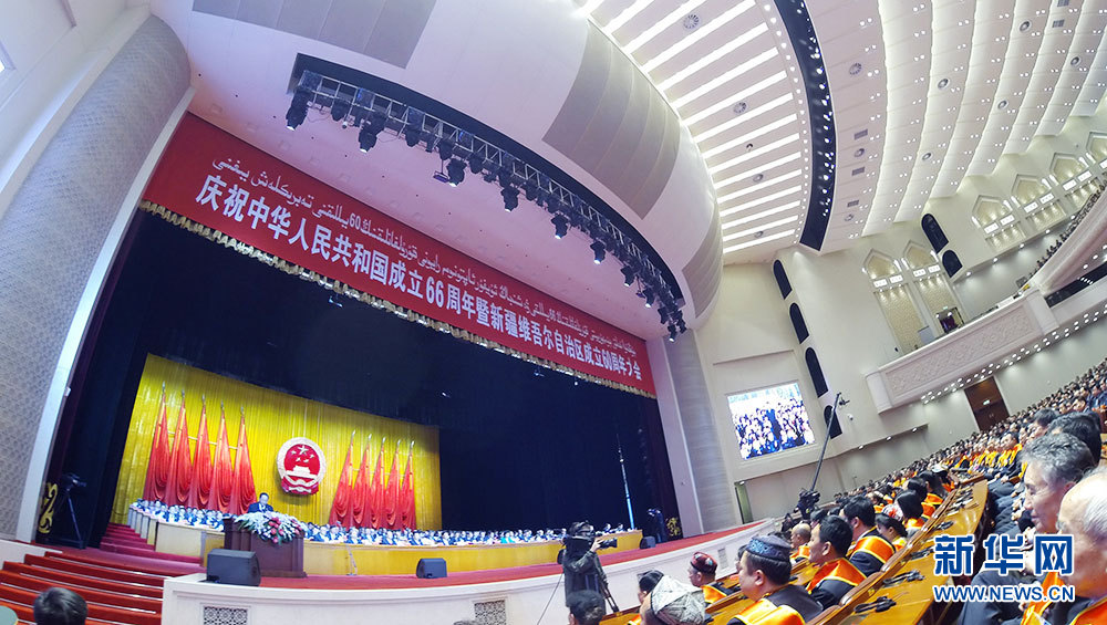 10月1日,庆祝中华人民共和国成立66周年暨新疆维吾尔自治区成立60周年大会在新疆人民会堂举行。图为大会现场。新华网记者 郭小天 摄