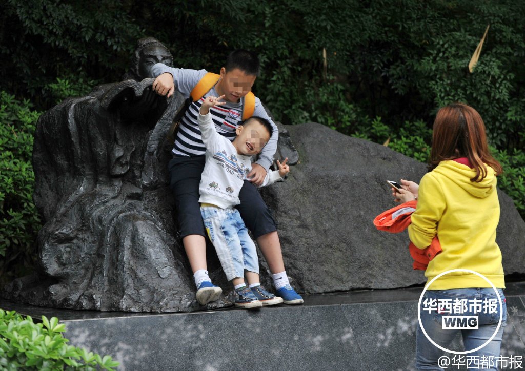 3日,成都浣花溪公园,诗歌典故园的“饮中八仙”雕塑上,诗歌大道杜甫、李白等“诗人”的雕塑上,不少家长带着孩子拍照。许多孩子在雕塑上爬上爬下,一名小孩还把雕塑当马骑…(记者张磊)