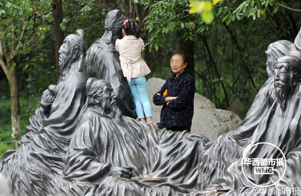3日,成都浣花溪公园,诗歌典故园的“饮中八仙”雕塑上,诗歌大道杜甫、李白等“诗人”的雕塑上,不少家长带着孩子拍照。许多孩子在雕塑上爬上爬下,一名小孩还把雕塑当马骑…(记者张磊)