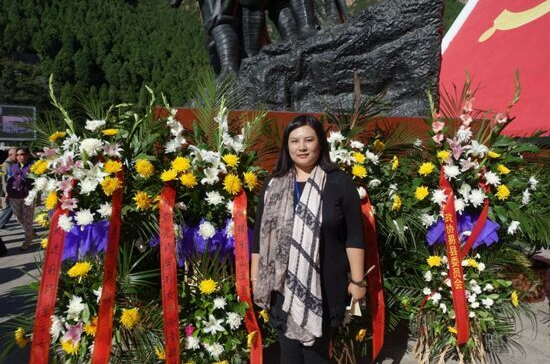 公祭仪式中,开国大将肖劲光孙女肖雨青在其敬献的花篮前留影。 资料图
