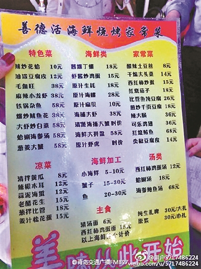 昨日,有网友爆料称,在青岛市乐陵路92号的“善德活海鲜烧烤家常菜”吃饭时遇到宰客事件引发网友热议。