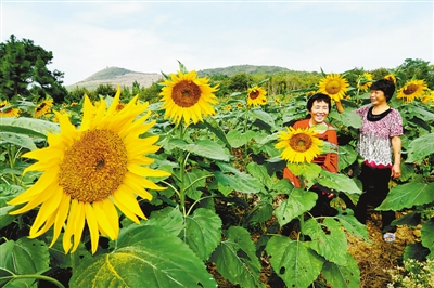 眼下,广西全州县大西江镇种植的千亩向日葵进入盛花期,在蓝天白云下,一畦畦向日葵花竞相绽放,金黄艳丽的朵朵葵花像一张张“笑脸”迎风摇曳,吸引了众多市民和游客前来观赏。图为游客在鲁塘村的葵花园里赏花。
