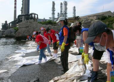 “7·16”事故后,大连市环保志愿者协会志愿者在大连老虎滩石槽浴场进行海面清理(2010年8月7日摄)