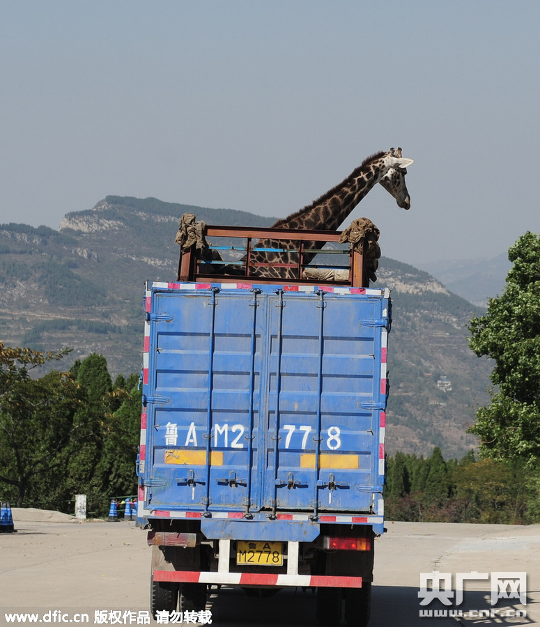 2015年10月9日,济南野生动物世界的8岁长颈鹿常青搬家。它坐上大卡车从700多米的山上老宅,一口气搬到七八十公里外位于章丘市的新家。