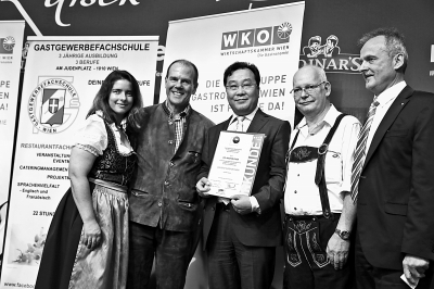 旅奥地利的华人企业家陈安申日前获奥地利联邦商会维也纳餐饮理事会颁发的金质奖章,以表彰他为奥地利传统餐饮业作出的杰出贡献。陈安申对本报记者说,自2012年以来,其团队先后成功经营奥地利多个具有悠久历史传统文化的餐饮企业,这是对奥地利传统文化的交接与传承。图为陈安申(中)在颁奖仪式上。