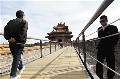 昨早9时,午门东马道城楼入口处,准备登楼的观众沿着“弓”字形的警戒线排起了队伍,为保证城墙安全,此处已经采取限流措施。