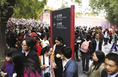 昨日,游客在武英殿前排队看《石渠宝笈》。当天,《清明上河图》展是最后一天。新京报记者 浦峰 摄