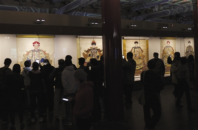 昨日,故宫午门雁翅楼,游客在看“普天同庆——清代万寿盛典展”。新京报记者 浦峰 摄
