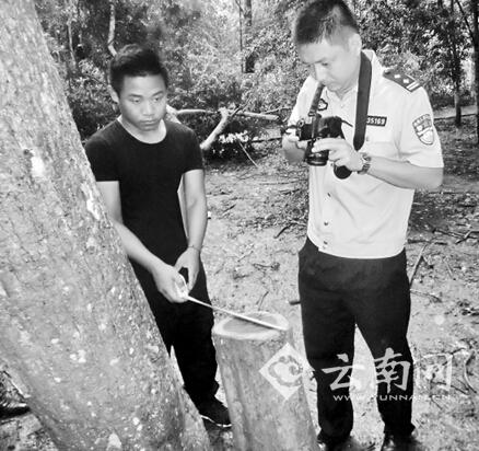 杨婷婷接到电话赶到现场时,才发现除被盗走的一棵外,还有一棵更大的降香黄檀主干上,相距40厘米的上下两端,还留下了分别被锯子锯入1/3和1/4深的两道锯痕。经安全保卫组主管岩总带人前来勘查后,发现不仅降香黄檀被盗,摆放在附近的一辆推车也不见踪影。泥泞的地上留有两道深深的车轮印,岩总带领保安人员沿着车轮印一路经过百花园往西,追踪至环绕植物园的罗梭江边时,发现林中还有拖运木料留下的痕迹,随后又在江对岸城子寨旁边停放的两条小船上,发现了蹭下来的降香黄檀树皮和树叶。