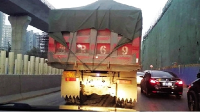 记者在网友拍摄的图片上看到,一辆悬挂豫AR8689的红色货车,车斗上方覆盖的黑色篷布被所运载的土石高高顶起,而其车尾号牌也较为模糊。