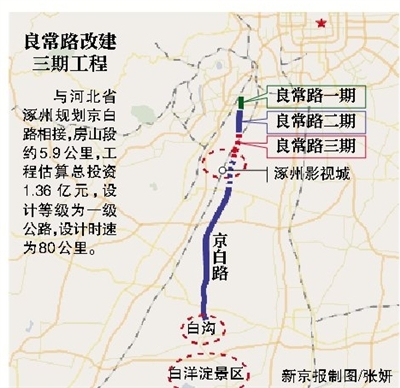 良常路改建三期工程北起琉璃河镇务滋村,南至京冀界(南白村),与河北省涿州规划京白路相接,房山段约5.9公里,工程估算总投资1.36亿元,设计等级为一级公路,设计时速为80公里。