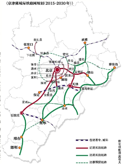 根据上报规划,京津冀城际铁路网将以“京津塘、京保石、京唐秦”三大通道为主轴,以京、津、石三大城市为核心,形成“四纵四横一环”为骨架的城际铁路网络,其中,“四纵”包括京石邯城际、京霸衡城际、津承沧城际、环渤海城际;“四横”包括京津塘城际、京唐城际、津保城际、石沧黄城际;“一环”为环北京城际。