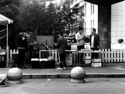 昨日中午,北青报记者在中国传媒大学中蓝学生公寓的道路两旁看到,这里聚集着近10家扫码送礼的商家,包括水果商、外卖商、整容公司、金融公司等,也有一些单看名字却不知道经营范围是什么的商家。