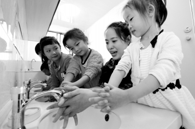 江苏省东海县第二幼儿园的老师在指导幼儿进行正确洗手。10月15日是“全球洗手日”,东海县各幼儿园开展了“天天洗小手 健康每一天”活动,通过多种形式向幼儿讲解个人卫生行为对健康的影响,引导他们加强卫生意识、防止疾病传染。张开虎 李允敏 摄