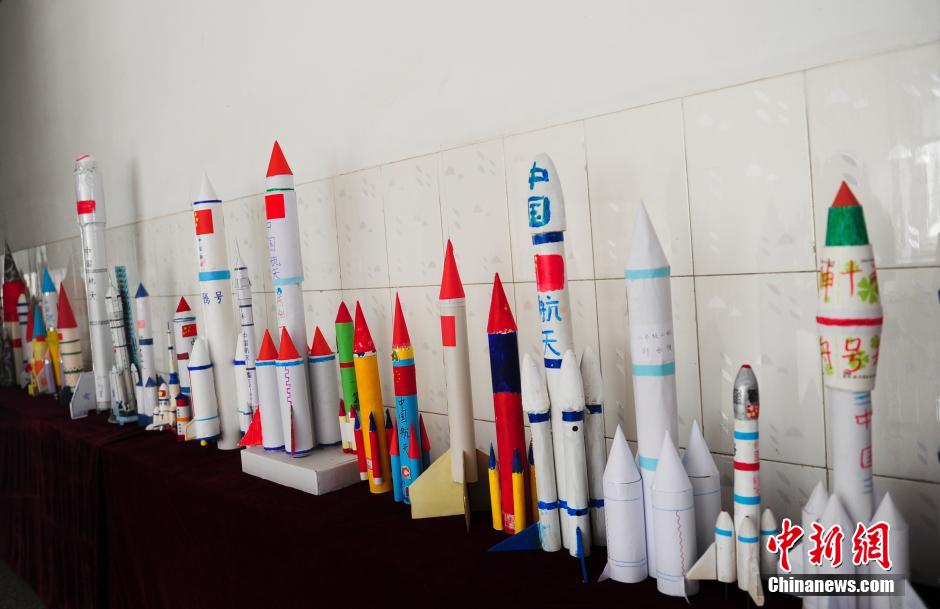 10月15日,小学生展示制作的“航天火箭”模型。当日,在济南燕翔小学的“火箭发射场”上,小学生们自制的“火箭”、“航天飞机”陆续冲天而起,飞向高空,圆了孩子们的航天梦。中新社记者 张勇 摄