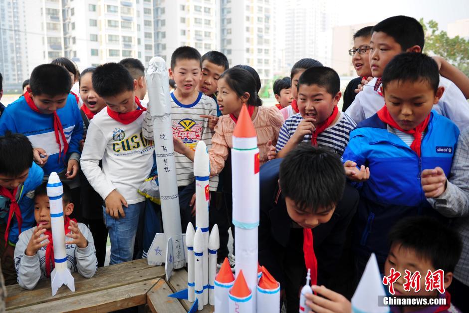 10月15日,小学生观赏同学们自制的“航天火箭”模型。当日,在济南燕翔小学的“火箭发射场”上,小学生们自制的“火箭”、“航天飞机”陆续冲天而起,飞向高空,圆了孩子们的航天梦。中新社记者 张勇 摄