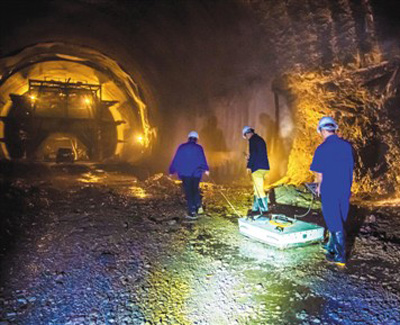 图片说明:图为施工人员利用地质雷达探测地下水脉走向。