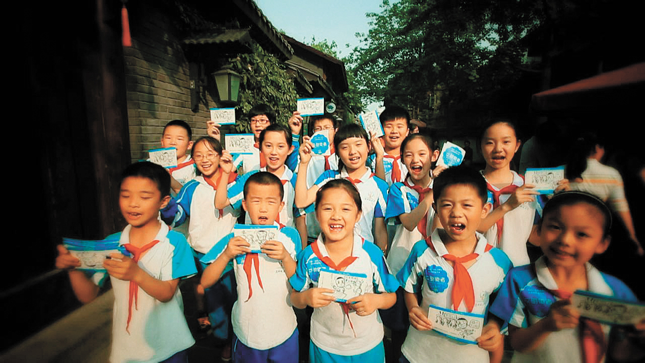 接地气的作品,最受大家的喜爱。如今,这套明信片不仅成了学校同学们争优时梦寐以求的奖品,更在第六届全国中小学生班队会赛课中,受到来自南京的小学师生们的喜爱。本来作为泡桐树小学老师赛课教具的明信片,被南京的师生们特地打电话申请寄了10套过去,用作该校德育课堂教学的教材之一。不仅如此,在宽窄巷子社区开展的文明使者行动中,该套明信片也作为泡桐树小学同学们传递文明的信物,发送到了来自天南海北的游客手中。