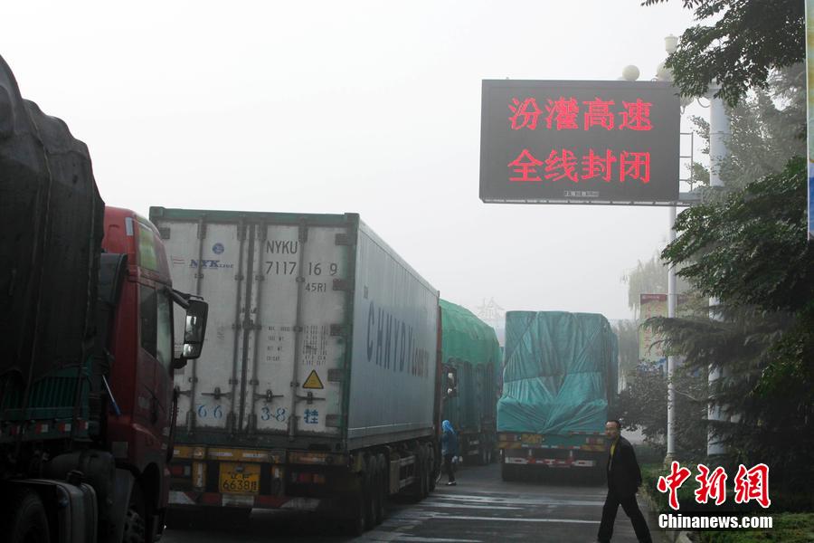 10月18日,车辆在长深高速江苏赣榆入口处排起长龙。当日,江苏持续出现大范围雾霾天气。受大雾影响,江苏境内京沪高速(G2)、京台高速(G3)、长深高速(G25)、沈海高速(G15)、连霍高速(G30)等高速公路局部封闭。思维 摄 图片来源:CFP视觉中国