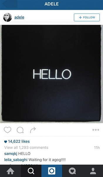 这短短的30秒,在社交网站上引爆了热议。Adele粉丝专页的Instagram上发了一张写着第一句歌词“HELLO”的照片,截至昨日下午4点,已有超过14000人点赞。