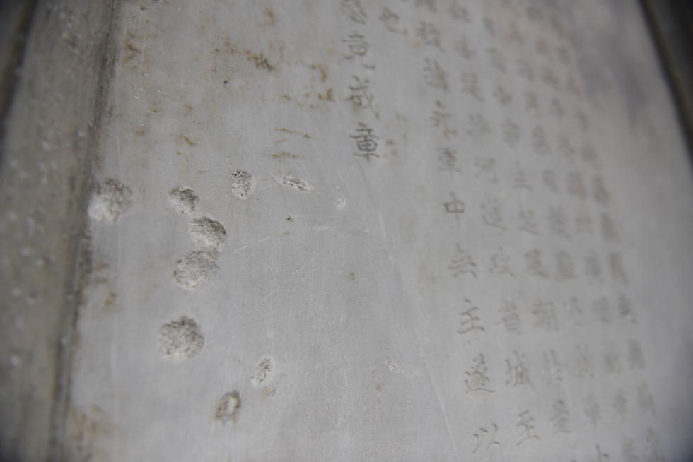 图为纪念塔上被人砸出的坑。碑体已受到严重破坏。
