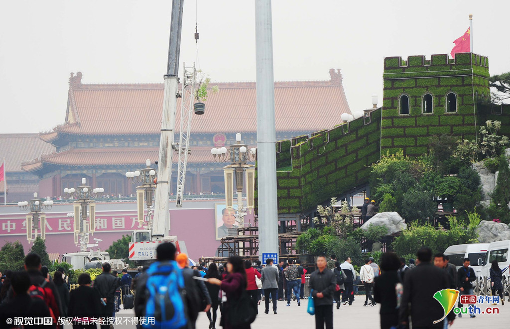 上午记者在天安门广场看到,国庆花坛“大花篮”的花冠已经被放到卡车上,只剩花筒伫立在原地。对面,纪念中国人民抗日战争暨世界反法西斯战争胜利70周年的长城花坛也在进行拆除,两台吊车正在将“长城”上的花盆逐一卸下,墨绿色的草皮已拆掉了近半,露出钢铁骨架。