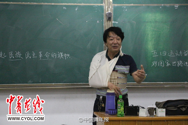 在河南科技大学的讲堂上,一位任课老师受伤后为了不耽误学生的课程,戴着护腰,绑着石膏绷带来上课。