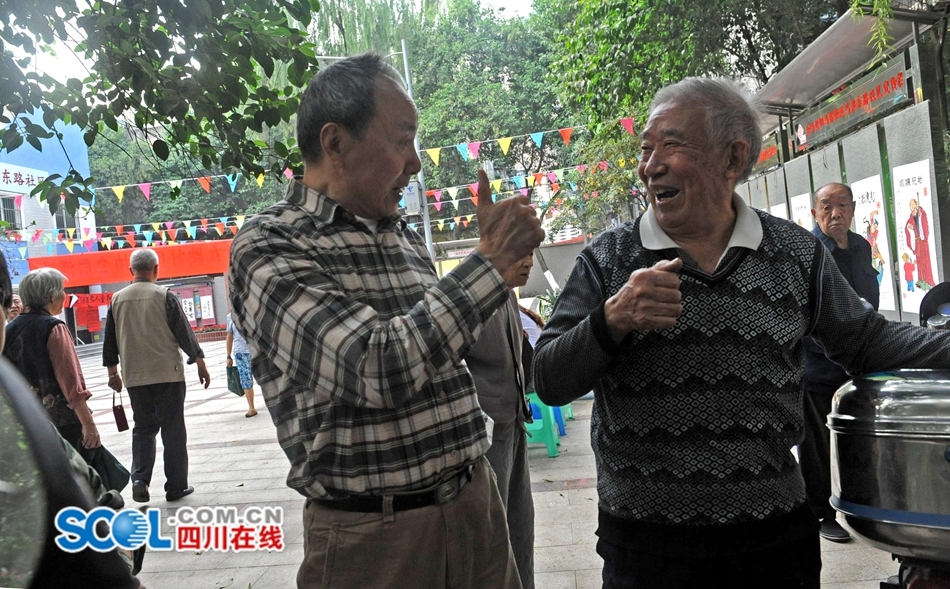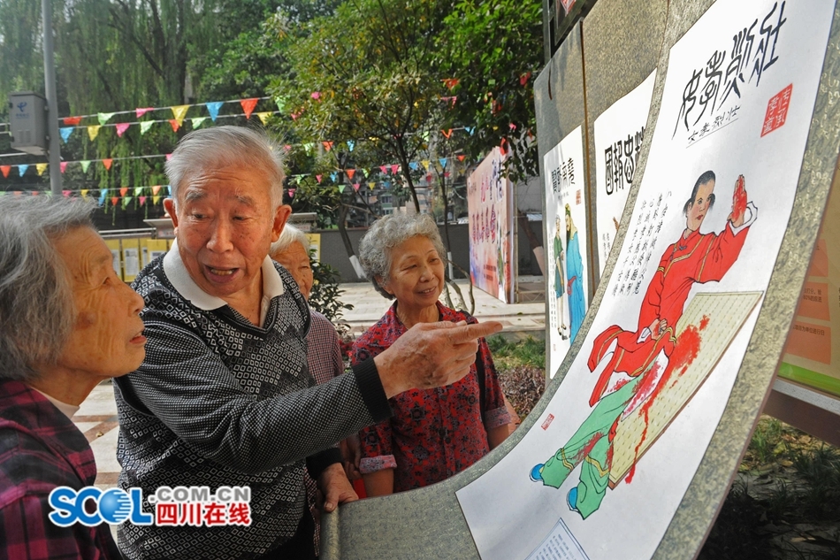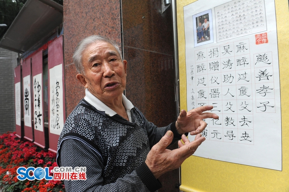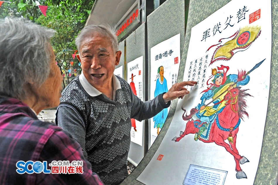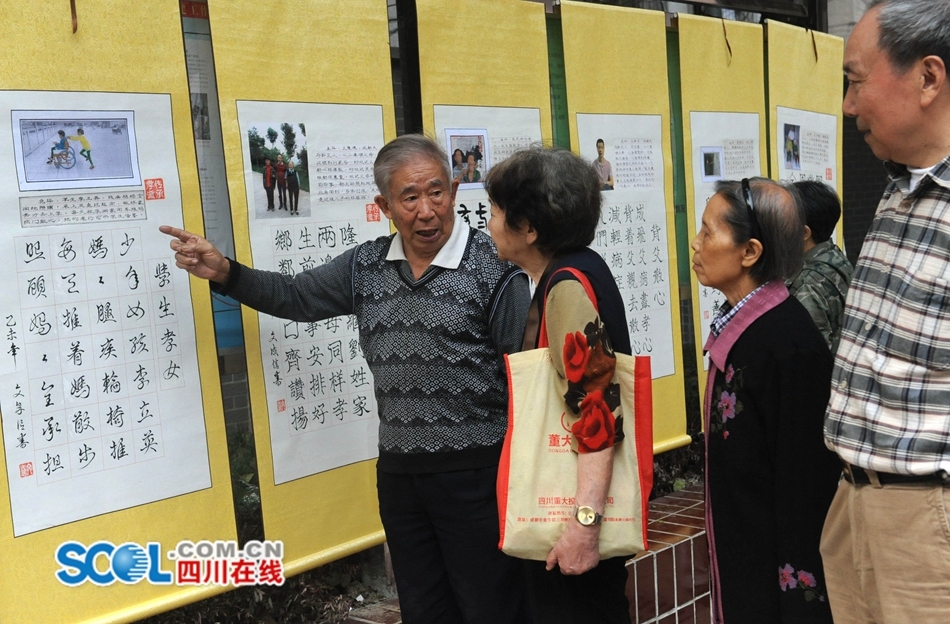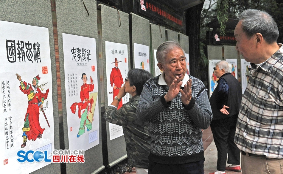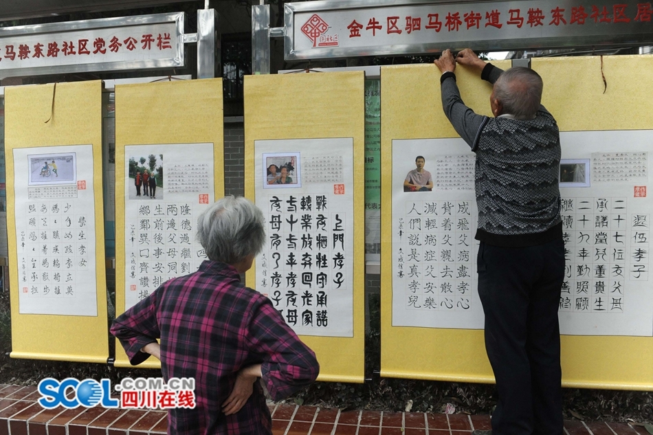 10月20日,重阳节到来之际,家住成都市金牛区马鞍东路曹家巷85岁的退休老人文成信,利用一年多时间通过报刊、网络、收集、整理并精心描绘的身边道德模范先进人物故事,组合成中华古今道德模范24孝书画作品到社区广场展出,受到群众点赞。(四川日报记者 吴传明 摄)