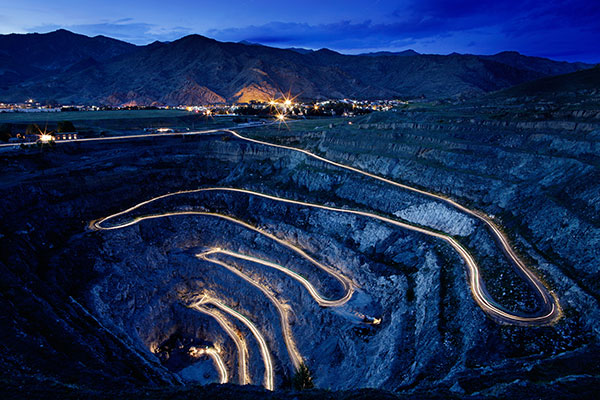 位于额尔齐斯河南的三号矿,就像一座巨大的罗马角斗场,一层一层开采平台螺旋下降。平台一侧的岩壁就是开采面,在爆破后将矿石运出矿坑。