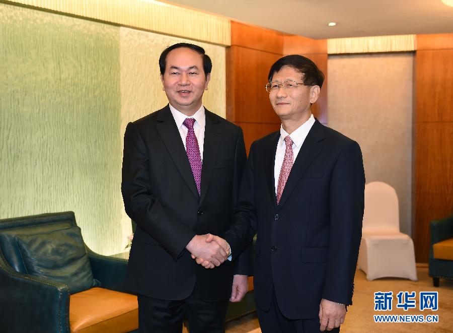 10月23日,中共中央政治局委员、中央政法委书记孟建柱在北京会见出席“安全促发展”中国东盟执法安全合作部长级会议的越共中央政治局委员、公安部部长陈大光。新华社记者张领摄