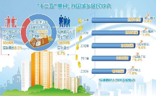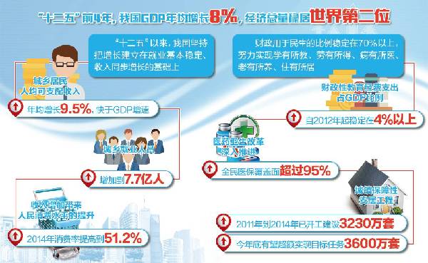 ——经济增速领跑世界。“十二五”期间,中国经济发展换挡不失速,年均增速预计可达7.8%,高于同期全球2.5%的年均增速,在主要经济体中名列前茅。“增长水平仍然让所有发达国家艳羡。”美国《时代》周刊网站评论道。