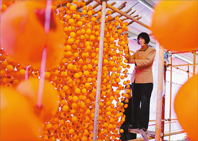 10月25日,山东省沂源县东里镇郑家旺村的农民在对柿子进行刮皮加工。霜降过后,沂源县的5万余亩柿子丰收,加工成柿饼后,出口韩国、日本等国家,成为当地农民增收的特色产业。